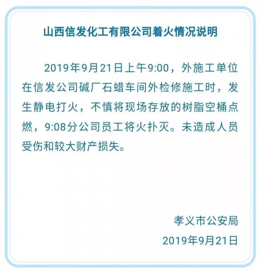2019年9月21日山西孝义市山西信发化工有限公司突发火灾事故,现场浓烟滚滚。官方通报原因为:工人未使用防爆手机,产生静电打火,不慎将现场存放的树脂空桶点燃!